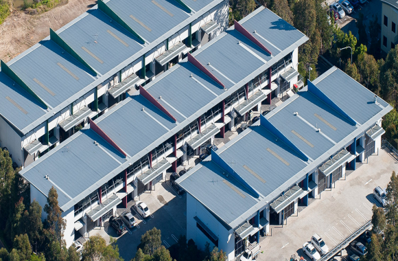 - Metal sloped roofs atop high-rises